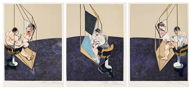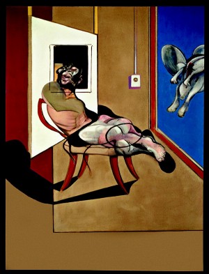 In Figura seduta l’ominide pare incaprettato al centro della stanza e tiene le mascelle spalancate nel grido. La sagoma e la faccia sono deturpate ma identificabili per significare il loro livore tragico che travolge, sconquassa chi le guarda mentre la distorsione aggredisce le tempie. La fisionomia lacerata scorre nel solco artistico tradizionale, polemizza a distanza con le avanguardie negazioniste del concetto figurale ritenuto troppo sorpassato e demodé. Nuovi canali quelli di Bacon, che risolvono la violenza delle fobie con l’infamia del destino contro cui è dannoso opporsi. Lo stringersi del torso è di tensione spavalda, la testa, quasi una maschera etnica, è torta rispetto al tronco e implica un gesto ribelle arrestato dalla massa uniforme. I piedi restano sospesi da terra mentre il getto cupo dell’ombra si dipana dal pavimento. L’ostaggio è accomodato in un interno dove pareti e luce dell’interruttore non indicano volumi tangibili. Gli intrecci dei muri e dei pannelli si incontrano su fughe arbitrarie che spingono a dubitare della correttezza prospettica. Queste ovvie perplessità spaziali mostrano lo scenario vuoto dove la bestia umana strilla ammanettata il suo turbamento angoscioso. Il bianco sfolgorante del paravento in bilico a mezz’aria, il blu elettrico della parete destra in cui appare pigiato un ammasso inquietante, il giallo ocra dello sfondo e il nero dell’ombra stridono con le campiture accostate in ordine e divise da netti contorni. L’ossessione di nascere e morire senza scopi precisi è data esclusivamente dalle impronte chiaroscurali che modellano le protuberanze del cranio e degli arti. Una carrellata lungo la produzione di Bacon fa notare il recupero del trittico di derivazione religiosa con la predilezione dei pannelli laterali a scapito del campo centrale. La figura mantenuta è per forza la medesima ma i riquadri decorativi di ambo i lati la posizionano in punti di vista diversi, convergenti però verso l’immagine frontale che sta nel mezzo. La riproposizione dei canoni dell’iconografia ieratica, al contrario, in Bacon compensa la rinuncia alla spiritualità della trascendenza per certificare la brutalità e il disaccordo prepotente che divide la sete della fede dalla palese insensatezza della vita. Per gemellarlo a Beckett, l’essere umano non riesce ad autodefinirsi un caso, un manichino insulso che deve recitare la sua parte nel derby di quel letamaio a cielo aperto che è il mondo, senza una ragione di fondo.