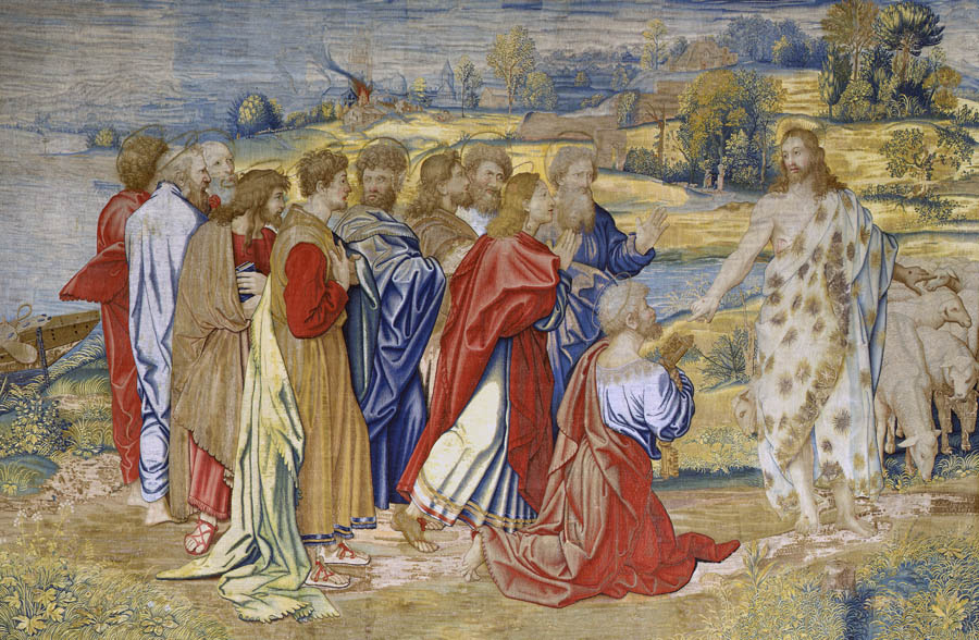 «Quasi tutti i regnanti europei, a prescindere dalla loro concezione del potere e della responsabilità nei confronti dei loro sudditi o dalla confessione a cui appartenessero, hanno considerato le “Storie degli Apostoli” di Raffaello come un fiore all’occhiello. Con i suoi cartoni per gli arazzi destinati al centro spirituale della residenza pontificia, la Cappella Sistina, Raffaello ha quindi creato uno stile o – forse sarebbe più giusto dire – una lingua franca della rappresentazione religiosa, nella quale ciò che era stato diviso dalle parole, dai dogmi o dalla politica poteva vedersi unito»: così ha scritto acutamente il prof. Arnold Nesselrath, in qualità di delegato per i Dipartimenti scientifici e i Laboratori dei Musei Vaticani. La “lingua franca” di Raffaello è la sua inarrivabile capacità di parlare un linguaggio comprensibile a tutti, e tale che tutti, a seconda del proprio piano di lettura o del livello di conoscenza, possano trovare una risposta. In “Pasce oves meas” o ne “La consegna delle chiavi a San Pietro”, il Cristo, splendente e contornato di bellissime pecore dal soffice vello e dallo sguardo quasi umano, è figura dolce e grandiosa alla quale ci sentiamo di tendere la mano, proprio come la tendono gli Apostoli.