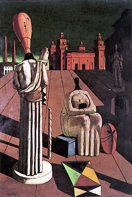 L’aurora metafisica di Roma viene poi doppiata dall’“alba” fiorentina del 1910, che vede la realizzazione del primo quadro improntato alla nuova tendenza, l’“Enigma di un pomeriggio d’autunno” (ed è la Firenze mistica e occultistica del «Leonardo»; la città di Giovanni Papini, col suo “tragico quotidiano” che rappresenta un po’ il corrispettivo letterario della “metafisica”; la città di Arnold Böcklin, proprio lui, che a Firenze ha vissuto quasi trent’anni, fino alla morte nel 1901, realizzandovi il capolavoro “L’isola dei morti”; e di Edward Gordon Craig, il grande innovatore della scena teatrale moderna, che vi si è stabilito appena tre anni prima e vi opera con successo). A Firenze De Chirico rivive e ripercorre la scoperta niciana della Stimmung (cioè l’atmosfera morale) del «pomeriggio d’autunno, quando il cielo è chiaro e le ombre sono più lunghe che d’estate, poiché il sole comincia ad essere più basso». Così racconta la sua esperienza di rivelazione: «In un limpido pomeriggio autunnale, ero seduto su una panca al centro di piazza Santa Croce a Firenze. Naturalmente non era la prima volta che vedevo questa piazza: ero appena uscito da una lunga e dolorosa malattia intestinale ed ero quasi in uno stato di morbida sensibilità. Tutto il mondo mi circondava, finanche il marmo degli edifici e delle fontane mi sembrava convalescente. Al centro della piazza si erge una statua di Dante, vestita di una lunga tunica, il quale tiene le sue opere strette al proprio corpo e il capo coronato d’alloro pensosamente reclinato… il sole autunnale, caldo e forte, rischiarava la statua e la facciata della chiesa. Allora ebbi la strana impressione di guardare quelle cose per la prima volta e la composizione del dipinto si svelò all’occhio della mia mente». Acquisendo la plastica classicità respirata a Roma, che De Chirico traduce in lezione di grande e ineccepibile pittura, cioè, in primis, di limpidezza dei valori della forma, prende corpo l’elaborazione di un nuovo, straniante spazio figurativo, dove il senso del reale sembra sfuggire alla stabilità e alle certezze di una rappresentazione oggettiva dell’esistenza. La pittura metafisica si slancia all’inseguimento delle «immagini della sospensione del tempo, dell’enigma, del mistero, dello spaesamento, di una realtà altra percepita nel silenzio e nell’immobilità, del meraviglioso che affiora dal quotidiano» (Calvesi). È in gioco il mistero dell’uomo e del suo esserci: la sua condizione di solitudine nel mondo, i suoi limiti spaziotemporali, il suo eterno anelito verso l’infinito. La scena metafisica è pervasa da un’atmosfera immobile, rarefatta e silenziosa, e da un misterioso senso di attesa: pare che il tempo si sia fermato, sospeso in una dimensione metastorica, mitica, assoluta. Dopo Firenze, anche Torino (con i suoi portici e le sue piazze: la città memore della follia di Nietzsche) e soprattutto Ferrara (con la sua tradizione esoterica e alchemica) avranno e daranno modo di precisare ulteriormente, con particolari, oggetti e simboli sempre nuovi, il complesso immaginario metafisico.